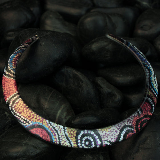This item is a joint work with Warlukurlangu Artists of Yuendumu Corporation, 3,5 hours of Alice Springs, NT. Add sophistication and elegance to any outfit with this meaningful unique piece of jewellery. Designed and handmade in Australia, it will be sent in an elegant gift box with an information leaflet (story associated with the artwork featured, name of the artist who will receive 10% royalties, instructions to make to size when possible).