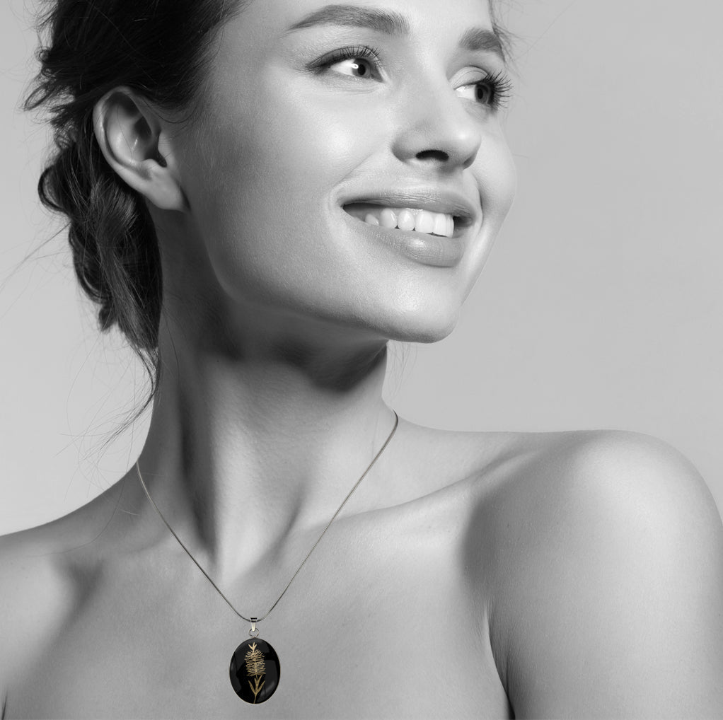 AUSTRALIAN NATIVE FLORA - BOTTLEBRUSH OVAL CIRCLE PENDANT ON A CHAIN NECKLACE - D858S - on Satchel