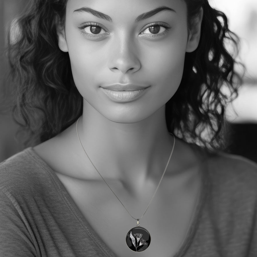 AUSTRALIAN NATIVE FLORA - EUCALYPTUS GUMTREE FLOWER CIRCLE PENDANT ON A CHAIN NECKLACE - D871S - on Satchel