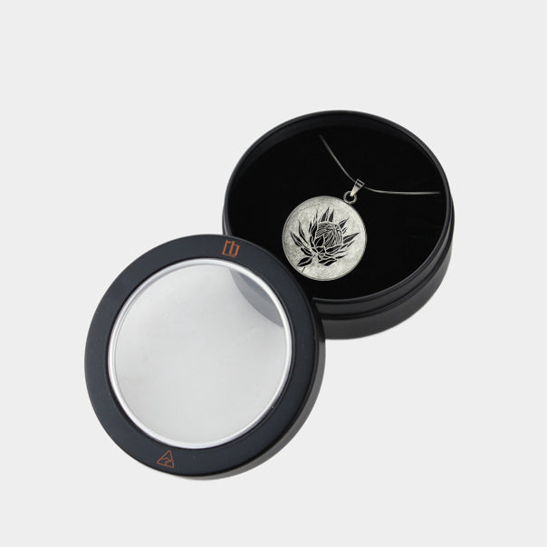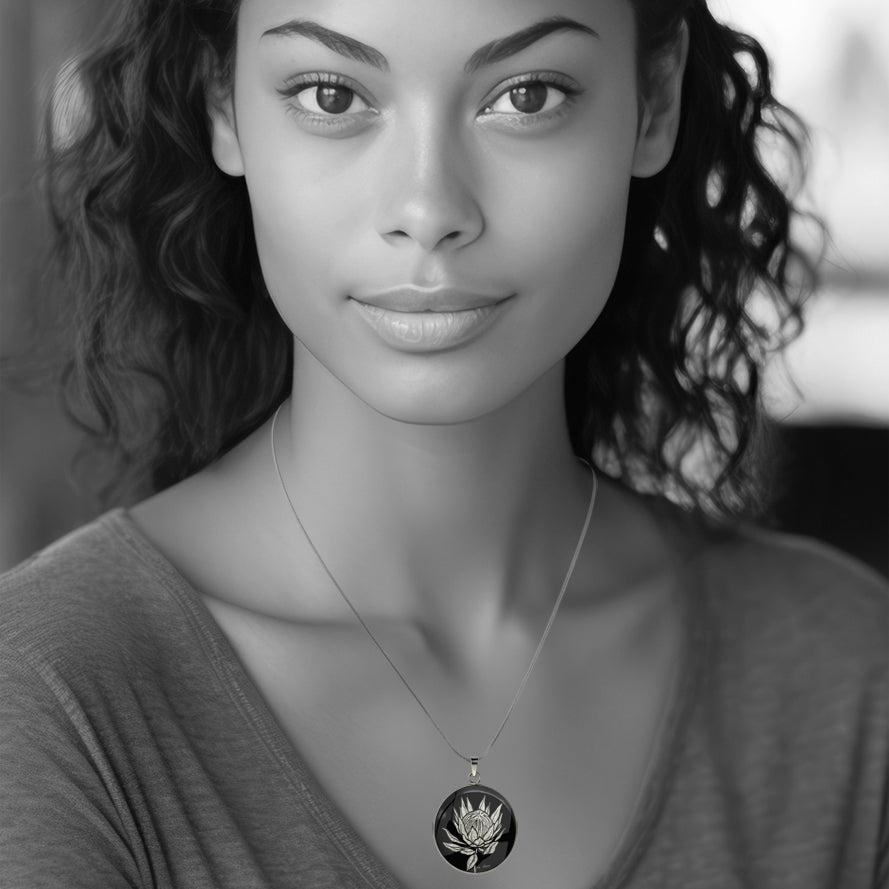 AUSTRALIAN NATIVE FLORA - PROTEA SUGARBUSH CIRCLE PENDANT ON A CHAIN NECKLACE - D927 - in Circle Box